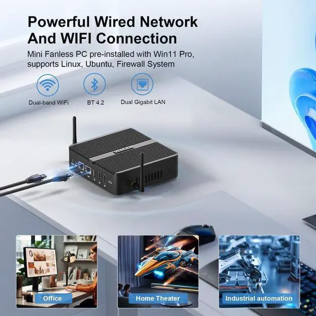 • 12th Gen J6412 ProcessorVENOEN Fanless industrial mini PC with J6412 processor (4 cores, 4 threads, 2.0GHz up to 2.6GHz). UHD Graphics,Compatible with Win 11 pro.Fanless Micro PC equipped with the 12th generation 10nm processor framework and 10W low-power TDP, which is faster and consumes energy. It allows you to easily deal with entertainment, office, education, and other scenarios.