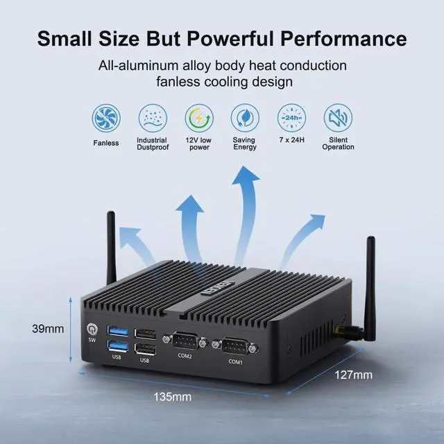 Convenient InterfacesFanless Dual NIC mini PC with 12V DC IN,USB3.0*2, RJ45 1000M*2, HD*2, DP*1, DB9 RS232 COM*2, Audio Jack. Support Watchdog, Wake-on-LAN, Auto power-on, PXE etc. Compact and portable size and weight (135*127*39mm, 1.5KG), you can take it wherever you want to go.