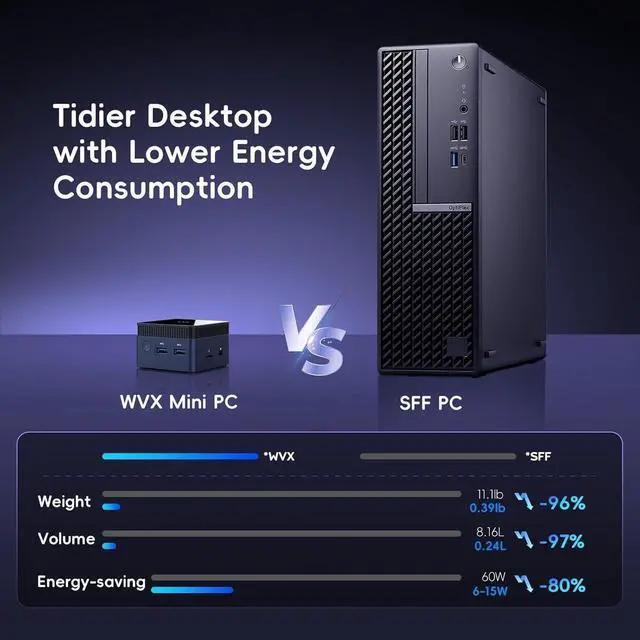 Pocket PC: weighs only 0.39lb, the size only 0.24L, 1/34 of the SSF PC size, and the power consumption only 12w/h, and only requires 0.288 KWh for 24 hours, saving energy and reducing the burden on the environment. It can also be put in your pocket and carried with you when you traveling. Its small size can keep your desktop clean and tidy