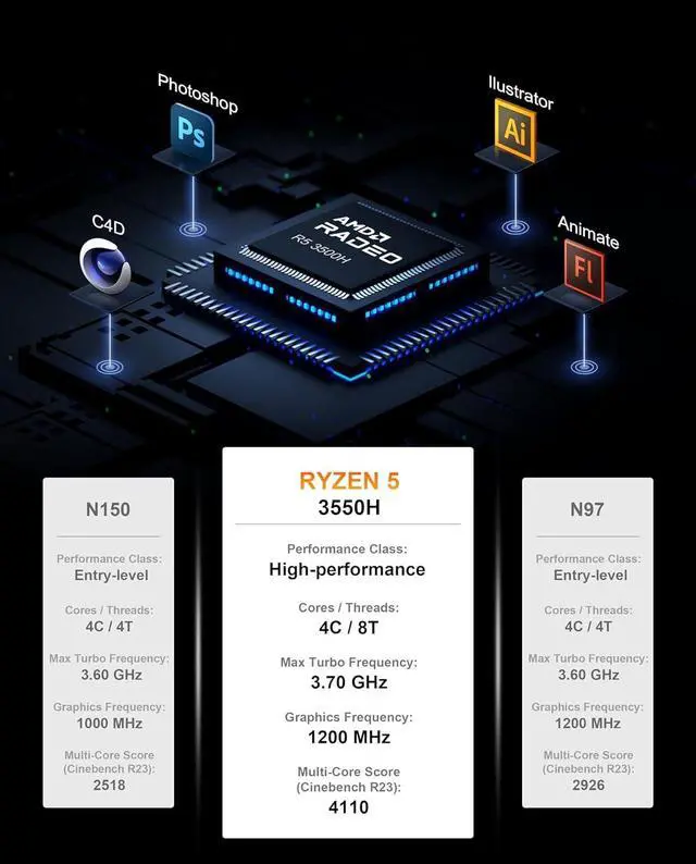 Powerful Ryzen 5 Mini PC Up to 50% Faster PerformanceExperience desktop-grade power in a compact body with the AMD Ryzen 5 3550H mini PC (4 cores, 8 threads, up to 3.7GHz Turbo). Compared to entry-level N150 or N100 mini PCs, this Ryzen 5 mini computer delivers up to 50% faster multi-core performance. The integrated Radeon Vega 8 Graphics provides superior iGPU power for smooth 4K video streaming, 3D modeling, and multitaskingideal for office, business, and home use