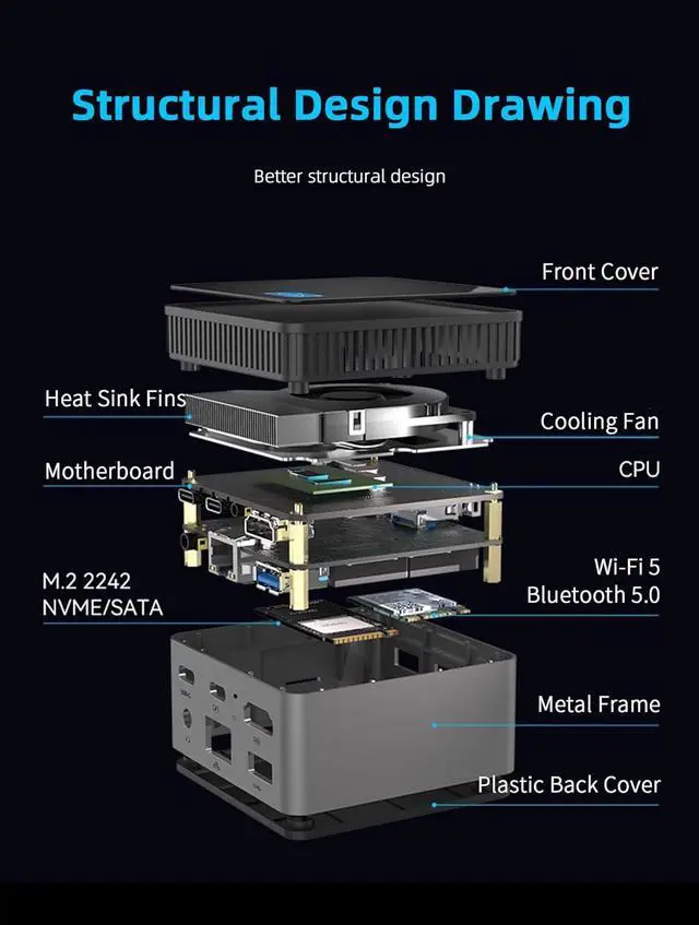 The video showcases the product in use. The video guides you through product setup. The video compares multiple products. The video shows the product being unpacked. Merchant Video CPUTwin Lake N150 (Quad-core, up to 3.6GH z) ProcessorGPUUHD Graphics (1GHz) RAM12GB LPDDR5 RAM, up to 16GBStorage0GB/128GB/256GB/512GB M. 2 2242 NVMe SSD, up to 1TBWireless LANWi-Fi 5 (Dual-band 2.4GH z/5GHz, 802.11 a/b/g/n/ac) Video output1x HDMI 2.0 (Supports 4K 60Hz); 1x Full-function Type-C (with DisplayPort Alt Mode) Power AdapterType-C (PD 2.0 / 3.0 compatible), 12V/3A, 36WlnterfaceFront: 2x USB 3.2 Ports, 1x USB 3.2 Port, 1x HDMI 2.0, 1x Gigabit Ethernet, Power