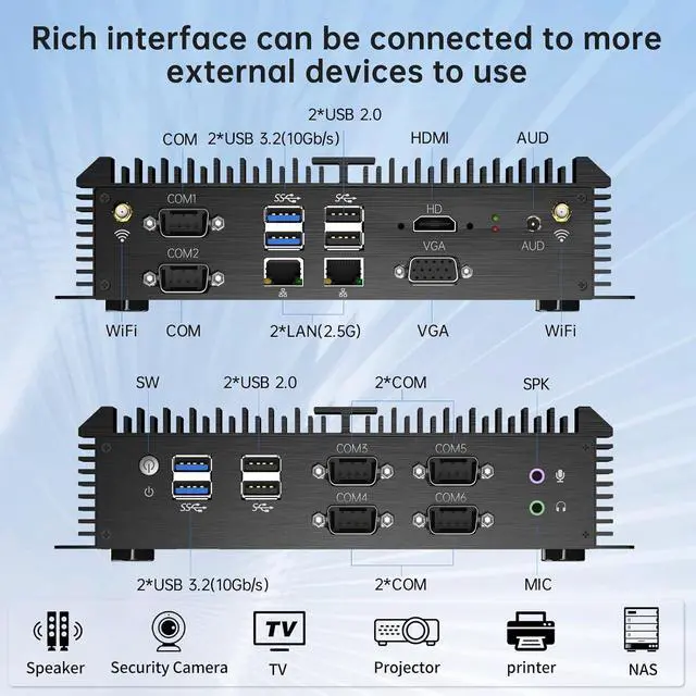 [Fanless Design & Ports] 4xUSB 3.2(10Gbs/s), 4xUSB2.0, 6xCOM RS232, 2x2.5G RJ-45 LAN ports, 1xHDMI port, 1xVGA port. Mini PC with metal casing fully enclosed fanless passive cooling design, with low power consumption, dustproof, zero noise, anti-vibration, strong anti-interference,High compatibility ability, 24 hours of stable operation in harsh environments. This computer use of all-solid-state motherboard, more resistant to high and low temperatures, increasing the life of the computer.