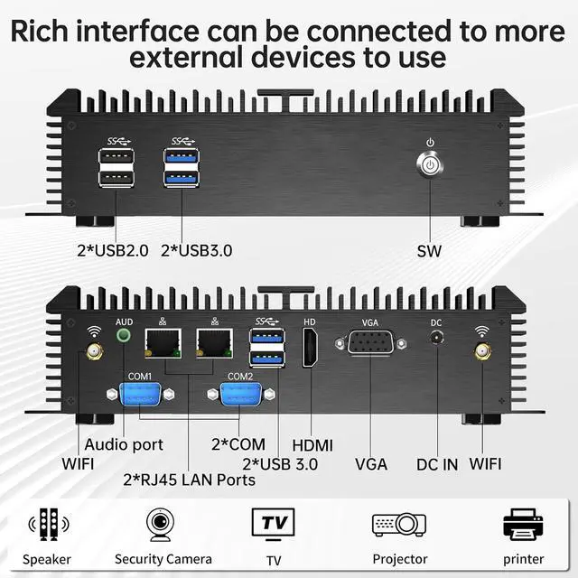 [Rich interface] Mini computer equipped with 2 x COM RS232 ports, 4 x USB 3.0, 2 x USB 2.0, 2 x Gigabit LAN ports, 1 x Audio in/out, Support connect dual Monitor via HDMI & VGA Ports. USB 3.0 provide fast transfer speed, increase productivity and save time. It supports many peripherals, such as medical equipment, industrial equipment, office equipment, monitoring equipment, etc.