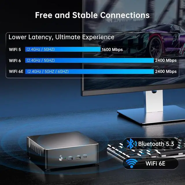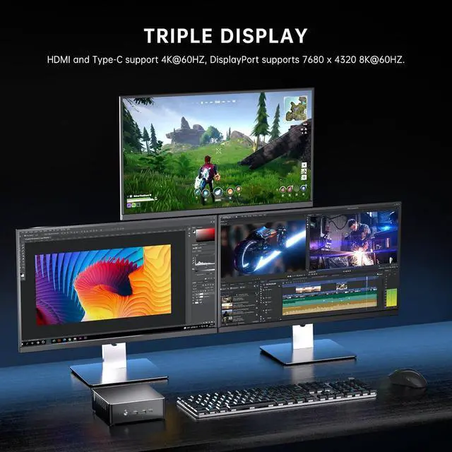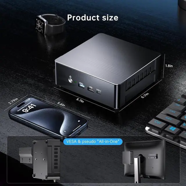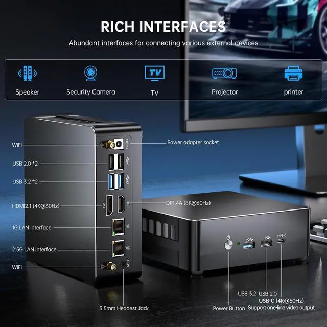 CPU ProcessorCore i9-13900H, 14 Cores 20 Threads, 24M Cache, Processor Base Frequency: up to 5.4GHzLithography 7nm SuperFin lithography technology.GPUIntel Iris Xe Graphics (Graphics frequency 1.50 GHz)RAM2 * So-dimm DDR4 slots, max support 64GB.SSD1 * M.2 2280 NGFF/PCIE X4 high speed SSD slot, max support 2TB; 1*2.5 inch SATA 3.0 slot, max support 4TB SSD/HDD.Wireless Link WIFI 6E(support 2.4Ghz/ 5Ghz/ 6Ghz frequency band) & Bluetooth 5.3( 50% faster transfer speed than Bluetooth 5.2)Ethernet Dual RJ-45 ports, RTL8111(support 10Mbps/ 100Mbps/ 1000Mbps) & Intel225(Max support 2.5Gbps)SystemPre-installed Windows 11 Pro (Comes with TPM2.0). Also supports Windows 10/11/windows server 2012/2016/linux/centos/ubuntu.Port 3* USB 3.2, 3* USB 2.0, 1* TYPE-C(Support file transfer and video output 4K@60Hz), 1* HDMI 2.1(Max support 4K@60Hz), 1* DP 1.4A(Max support 8K@60Hz), 1* 3.5 Jack, 1* AUD.More FunctionRTC/Wake on Lan/Auto Power on(BIOS setting)Dimension & Weight 145x145x46mm/ 5.7x5.7x1.8inch; 0.6kg/ 1.3lb.Package Included:1* Mini PC, 1* Power Adapter, 1* HDMI Cable, Dual WiFi Antenna, 1* VESA Mount with Screws. This Mini PC is ideal for diverse usage scenarios such as entertainment, office, online education, industry, etc.