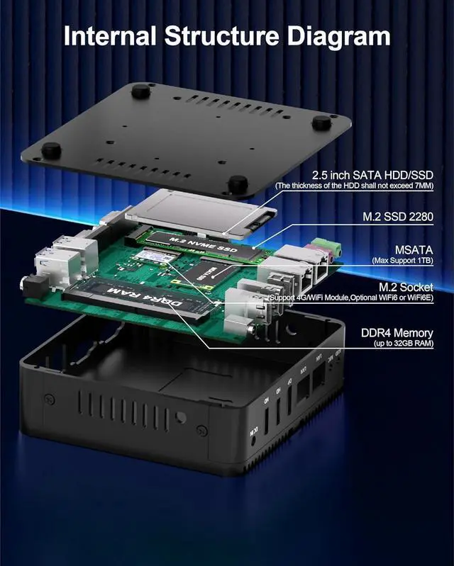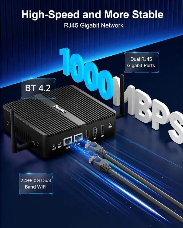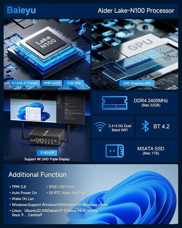 CPUCeleron Processor J4125 (4MB Cache, 4 Cores 4 Threads, Base Frequency 2.00 GHz Turbo Frequency 2.70 GHz)Processor GraphicsUHD Graphics 600Memory Types & Speed1 × DDR4 SO-DIMM 260Pin & 2400 MHzMax Memory Size32GBExtended Storage1 × mSATA slot (For installing mSATA SSD) + 1 × M.2 2280 slot, Only support NVME (PCIE 3.0X2) SSD + 1 × SATA 3.0 slot for installing 2.5 inches SATA SSD/HDD(not included)Operate SystemSupport Win10/11, Linux, Ubuntu, OPNsense and other operating systemsVideo Output portsHD 4096*2160@30Hz (4K) + VGA 1920*1080@60Hz Dual Display OutputCOM Ports2 × DB 9Pin RS232 COM PortsUSB Ports2 × USB 3.0 Gen1 Ports, 2 × USB 2.0 PortsLAN Ports2 × RJ45 Gigabit Lan, Realtek 8168/8111(1000M)WiFi & BTDual Band WiFi (2.4G+5.0G) and BT 4.0BIOSSupport Auto Power On, TPM2.0, Wake On LAN, Watchdog, PXE, Resume By AlarmWork Environment-10--60(14F~140F) , 30%--90% HumidityCase MaterialFull Brushed Aluminum AlloyMini PC Size & Weight13.5 × 12.7 × 3.9CM (5.3 × 5.0 × 1.5 inch); 0.6KG (1.3 lb)Power SpecificationOutput: DC 12V/5A; Adapter Input: AC 110-240V, 50/60Hz; Consumption: 50W Is Our Product Quality Good? Baieyu BH3 Series Fanless Mini PC Technical Specifications