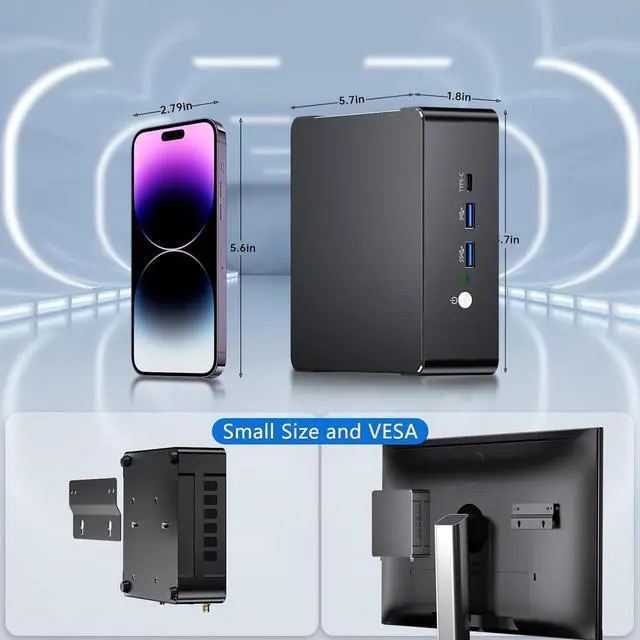 Processor Base Frequency: 3.8GH z (up to 5.0GH z). GPUIntel Iris Xe Graphics Card (Graphics frequency 1.45 GHz). RAM2 * \u200bSO-DIMM DDR5 slots, supports up to 64GB (32GB x 2). SSD2 * M. 2 2280 Slot, supports up to 4TB NVME Pcie 4.0 SSD. Wireless LinkWIFI 6E(support 2.4G hz/ 5Ghz/ 6Ghz frequency band) & Bluetooth 5.3 ( 50% faster transfer speed than Bluetooth 5.2 ). EthernetDual RJ-45, built-in Intel 225 network card (Max 2500Mbps) & RTL8111 network card (Max 1000Mbps). SystemPre-installed Windows 11 Pro (built-in TPM 2.0 ). Also supports Windows 10/11/windows server 2012/2016/linux/centos/ubuntu. Port3* USB 3.2, 3* USB 2.0, 1* USB 4.0 (Support file transfer and video output 4K@60Hz), 1* HDMI 2.1 (Max support 4K@60Hz), 1* DP 1.4A (Max support 8K@60Hz), 1* 3.5 Jack, 1* AUD. More FunctionRTC/Wake on Lan/Auto Power on (BIOS setting). Dimension & Weight145x145x46mm/ 5.7 x 5.7 x 1.8 inch; 0.6 kg/ 1.3 lb. Package Included1* Mini PC, 1* Power adapter, 1* HDMI cable, 2* WiFi antenna, 1* VESA mount with screws, 1* PD to HDMI adapter.