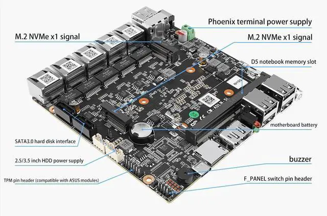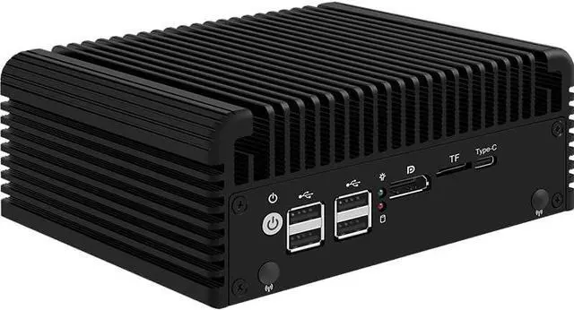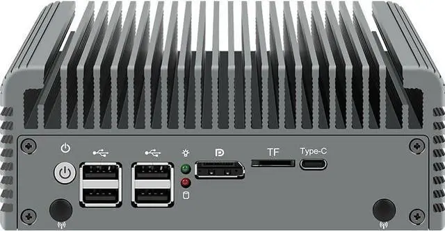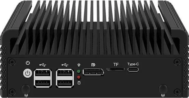 Support two storage: 2xNvme SSD+2x2.5''SATA SSD/HDD., 1xMini-PCIE wireless slot, support WiF connection. Support Wide voltage input 12-19V. Support 1xHD-MI+1xDP dual display output synchronously and asynchronously. 1xDDR5 Ram Slot Support Maximum 32GB DDR5 4800MHz(suggest to choose brand like samsung,kingston,Hynix etc. to avoid compatiable issue) , 1xMini-PCIE wireless slot, support Support Wide voltage input 12-19V. Support AES-NI, ESXI, Watchdog, Auto power on,PXE( if your bios version not support the function, please ask for us the bios file to update it) Full Aluminum Alloy color shell for heat dissipation, Exquisite production craft on outside design. Fanless system without cooling fan, fit for industrial grade field, work as long as 24 hours. Low consumption TDP only 10W and can be mounted back of monitor by VESA bracket(optional).