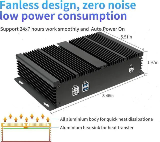 [Small Size But Powerful Performance] support 7*24 hours uninterrupted and stable operation, support power on the boot, timing boot, network wake up. The host adopts industrial control design, with super environmental adaptability, fully closed dust, corrosion resistance, shock resistance, with better electromagnetic compatibility and high anti-interference ability.