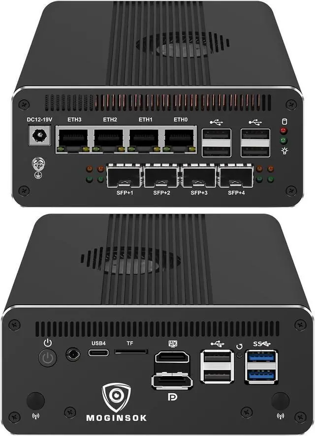 The body shell of this MOGINSOK 10gbe firewall pc is all made of aluminum and with upgraded version slient copper fan cooling design, compare to last version the cooling fan is more powerful but also reduce noise.