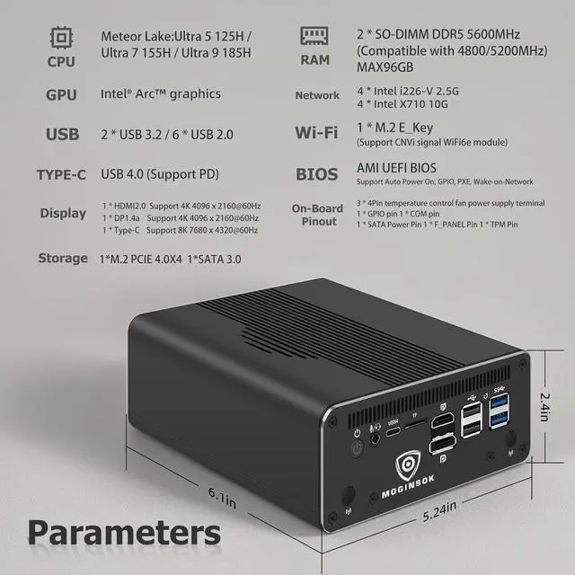 CPU14th Gen Intel Core Ultra 5 125H(14C/18T) Up to 4.5GHz / Ultra 7 155H(16C/22T) up to 4.8GHzNetwork Card4*Intel I226V 2.5Gb network card+4*Intel X710 10Gbe network card Ram2*Laptop SO-Dimm DDR5 RAM slots support 8/16/24/32/48/96G DDR5, (suggest to install SamSung/Kingston/Crucial etc. for 32G single )Storage1* M-key M.2 NVME PCIe 4.0X4 2280 slot+1*SATA3.0 SSD/HDD Slot(Install externally)Support OS Preinstall Pf-sense CE 2.7.x /Compatiable with OPNsense/ Ubuntu /Windows /VM OS(like ESXI/PROXMOX/Debian etc.)Display1*HDMI 2.0 +1*DP 1.4a Support 4k@60Hz +1TYPE-C Support 8K@60HzUSB 2 * USB3.2 6*USB 2.0+1*USB C 4.0 40G/bps(SUPPORT PD at least 19V 120W)Expansion1*M.2 E-Key support CNVi WIFI ModemGPUIntel integrated ARC GraphicsSize155(L)*133(W)*61(H)mm Compatible with various open source operating systems and software like OPNsense ,dd-wrt, FreeBSD, ClearOS, CentOS, OpenVPN , PVE, ESXI, vmware etc. (except "no ram no ssd" configurations, others are default installed with PF-sense CE 2.7.X ).