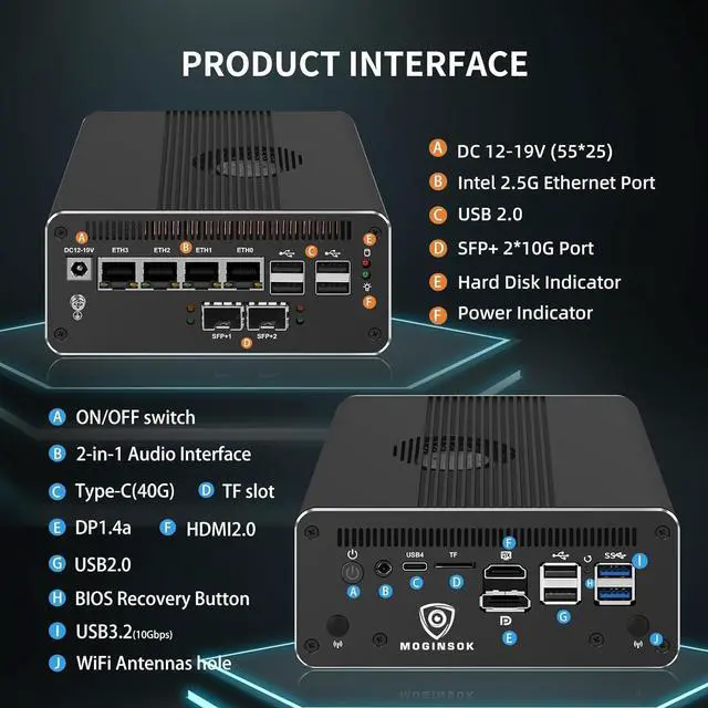 The body shell of this MOGINSOK 10gbe firewall pc is all made of aluminum and with upgraded version slient copper fan cooling design, compare to last version the cooling fan is more powerful but also reduce noise.