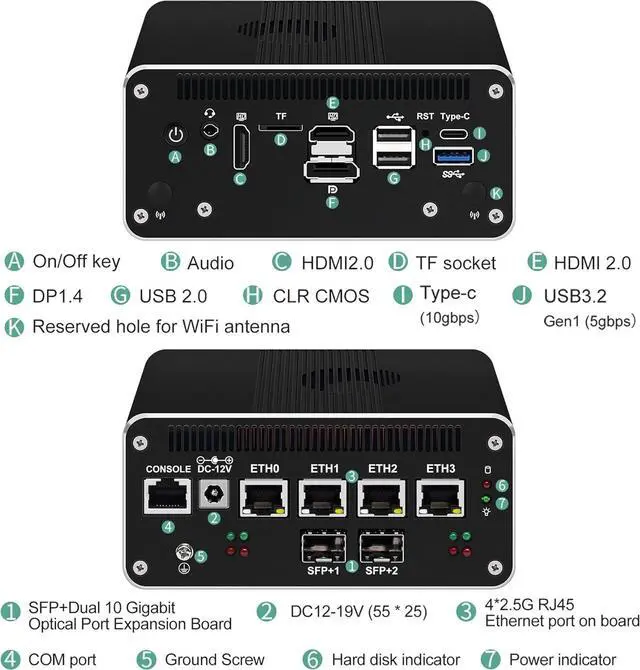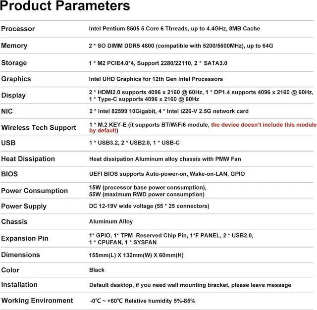 This powerful mini PC is perfect for home or small office network security. Featuring a Pentium Gold 8505 processor 5-core 6 threads, 8MB Cache, up to 4.4GHz. It supports AES-NI to keep your network and data secure and provides high performance for firewall, VPN, and routing applications. With dual 10GbE and four 2.5GbE Ethernet ports, it can allow for fiber uplinks and has ample connectivity for high-speed switching and routing and handle high bandwidth traffic with ease. Max 64GB of RAM and having multiple hard drive slots to provide ample storage for logs, backups, or a small file server and processing power for your network's security needs. An ideal micro firewall computer, it can function as a VPN gateway, soft router, firewall, personal computer and more. Robust yet affordable, this compact pc keeps your network safe and organized. At just over 6.1inch x 5.2inch x 2.4inch in size, it takes up little space but protects your network 24/7.