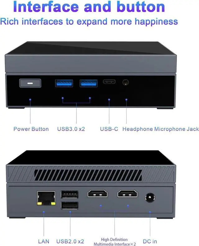 Ports: DC Jack 5.5mm x1, USB 2.0 x2, USB 3.0 x2, RJ45 1000M x1, High Definition Multimedia Interface (4K@60Hz) x2, Audio Jack x1, Type-C (full function) x1