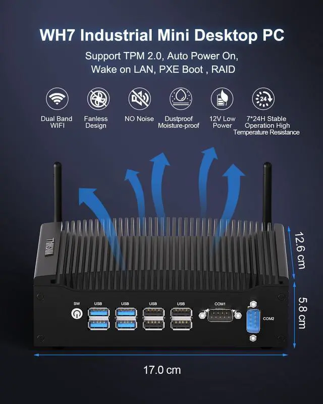 Silent Micro PC The Fanless mini pc is equipped with a 8th gen Core i5 8350U processor (4C/8T, 1.7 GHz to 3.6 GHz). Compatible with Win11 Pro/Win10 Pro/Linux Ubuntu/Debian, 12V 5A(60W) low power consumption, Powerful processing performance eliminates lag in multitasking, supports 7x24H stable operation
