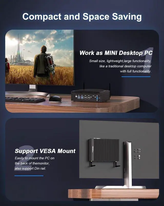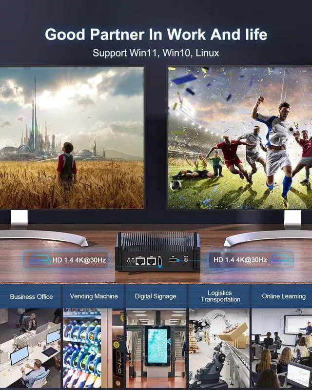 4K Dual Display Business PC Fanless Mini computer with built-in UHD 620 Graphics, dual HD display ports supporting HD 4K Output, 4096 x 2304 resolution, easily expand multi screen display, Watch sports events while working on documents, doubling efficiency. Fully meets the needs of office work, home theater, digital billboard, CCTV, and self-service terminals
