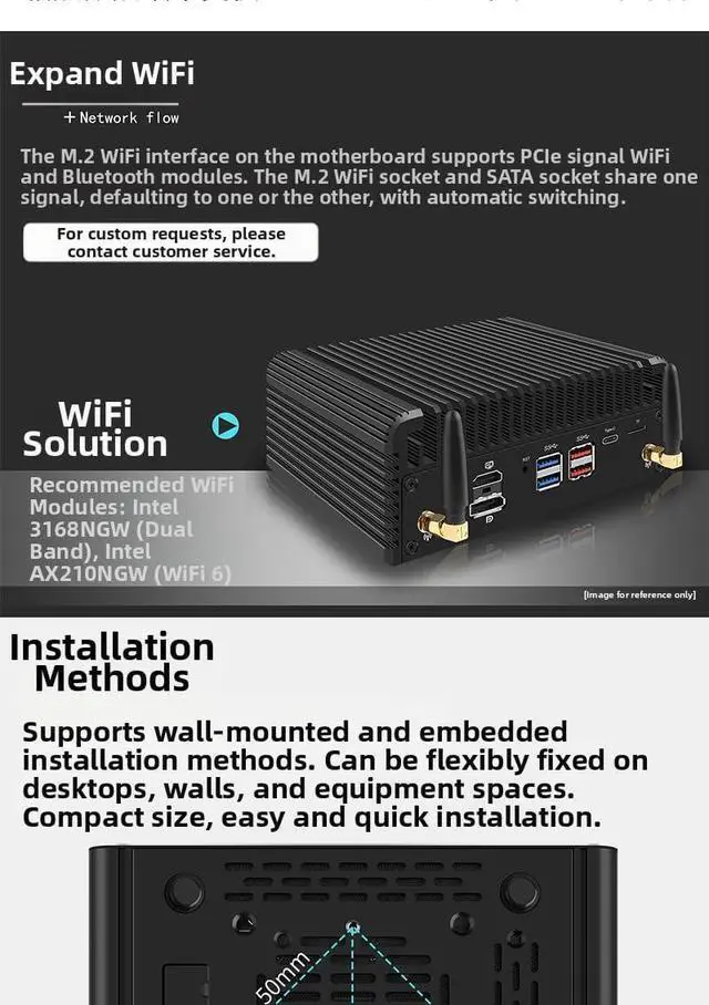 UHD Graphics & Dual Display Mini PC Firewall with HD+DP 2 display interfaces support 4K@60Hz, N150 processor integrated UHD Graphics 24EUs 1000MHz. Fanless design quiet running without noise. Supports 12V 4 Pin 80 x 10mm small fan (Pac