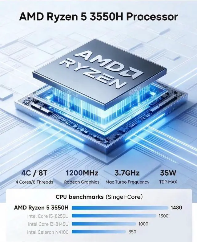 Powerful AMD Ryzen 5 3550H Processor \u2013 Experience exceptional performance with the AMD Ryzen 5 3550H (4 Cores/8 Threads, Base 2.1GHz, Max Boost up to 3.7GHz). This compact powerhouse delivers over 200% higher performance than the N150 (Reference from PassMark). It significantly outperforms the N95/N100 with a 60% increase in CPU speed and a massive 125% boost in GPU performance thanks to its Radeon Vega 8 Graphics. Operating at a high-performance 35W TDP, it offers robust processing power that rivals mainstream mobile processors, ensuring seamless multitasking and professional-grade efficiency.