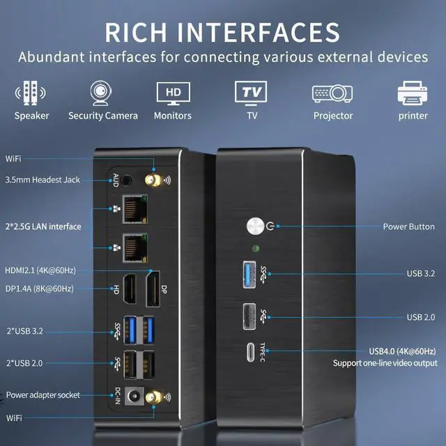 • [8K Tri-Display & Rich interfaces] This desktop computer comes with 3 x USB 3.2, 3 x USB2.0, 1 x Auido, 2 x WiFi Antenna Port, 1 x USB 4(4K@60Hz), 1 x DP1.4A (8K@60Hz), 1 x HD 2.1 (4K