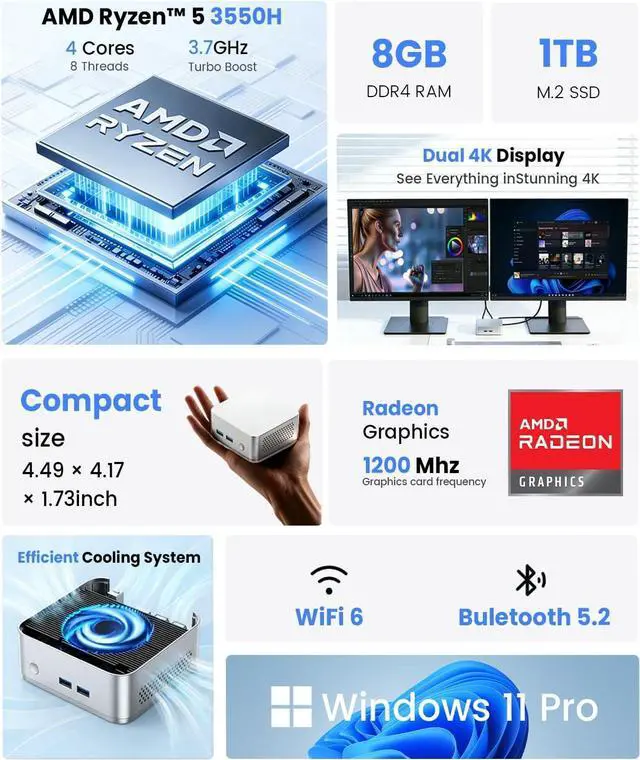 Stunning 4K Dual Screen Display & AV1 Support \u2013 Elevate your visual experience with upgraded AMD Graphics (up to 1000MHz). Supporting 4K video playback and AV1 decoding, it\u2019s perfect as a home theater PC. Dual HDMI 2.0 ports allow you to connect two 4K@60Hz displays simultaneously, boosting your efficiency for work, design, or entertainment.