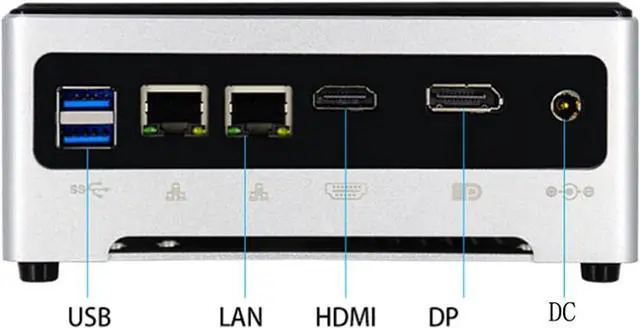1xPower Switch, 1x19V DC In, 6xUSB 3.0, 1xDP, 1xHD, 2xRJ45 Giga LAN, 1xMIC&SPK