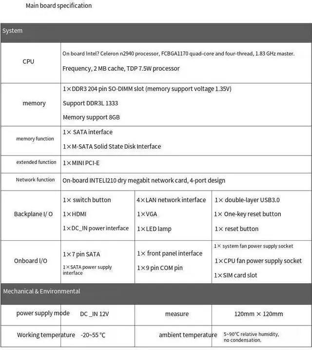 Excellent performanceThe Mini computer Onboard Inter Celeron N2940 processor, FCBGA1170 quad-core and four-thread, 1.83 GHz master Frequency, 2 MB cache, TDP 7.5W processor.