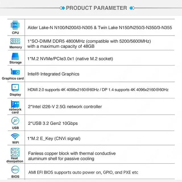 CPU:P5 MAX support Alder Lake-N N100/N200/3-N305 & Twin Lake N150/N250/3-N350/3-N355 processor,Suitable for handling daily tasks