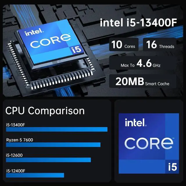 Cutting Edge PerformanceMini PC Gaming Powered by Core i5 13400F CPU, 10 Cores 16 Threads, 20M Cache, Max 4.6GHz, Windows 11 pro (64 Bit). GeForce RTX4060Ti 8G GDDR6, supporting ray tracing and AI cores. This powerful gaming PC is capable of running all your favorite games
