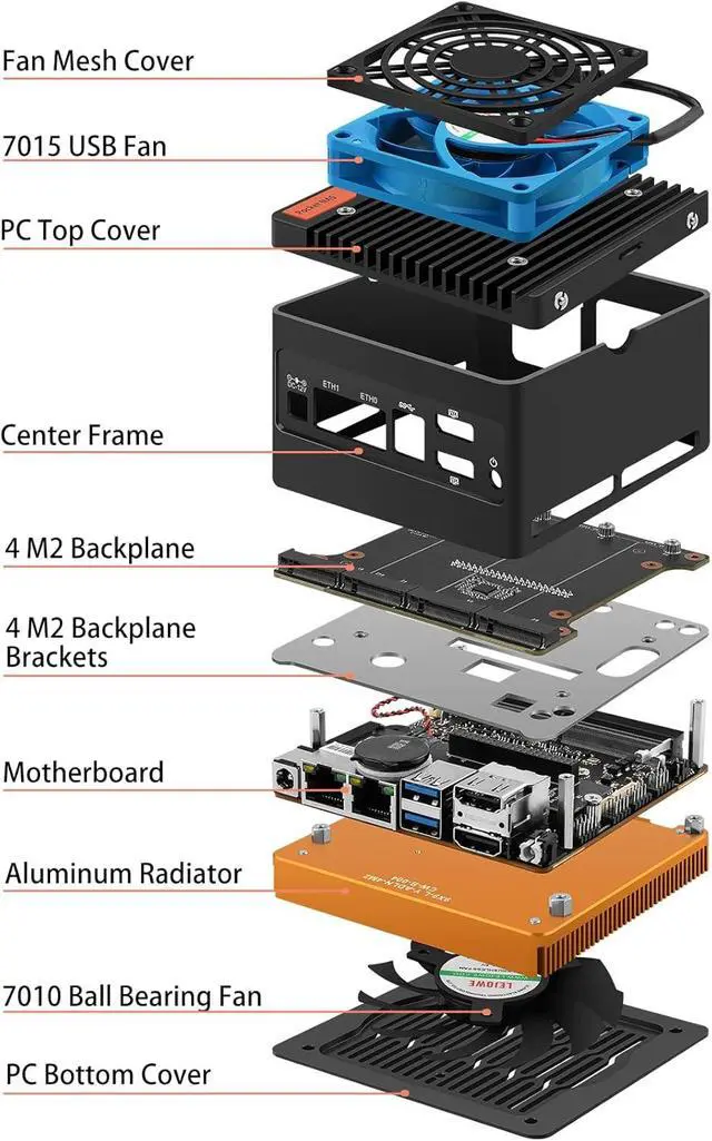 Large Capacity: Features 1×DDR5 slot (supports up to 48GB RAM) and 4×M.2 NVMe 2280 PCIe 3.0 x1 slots, ideal for 4-Bay NAS and storage server applications.