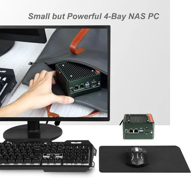 Complete Package: Includes 1×4-Bay NAS Mini PC (barebone without RAM/SSD), 1×12V 5A power supply, HDD screws, rubber feet, and user manual.