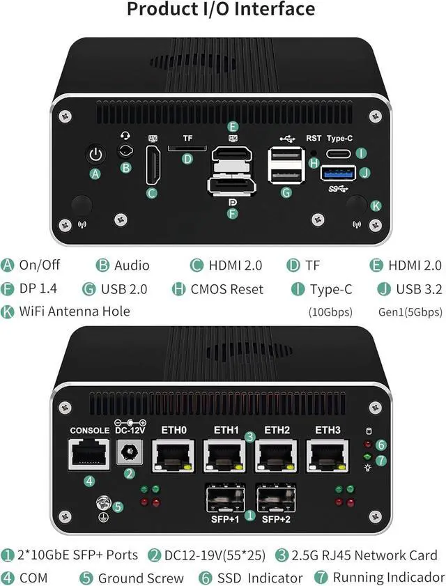 Input&Output InterfaceThe mini computer is equipped with 2xHDMI 2.0 +DP 1.4 Support 4K@60Hz Triple display, 1*USB3.2Gen1& 2*USB2.0,1*Type-C,2*10GbE SFP+Ports,4*2.5G Ethernet Ports1*RJ45 COM port.The rich interface will bring you a comfortable Internet experience.