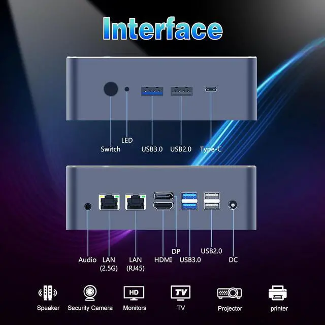 Rear I/O: 2 x USB 3.0, 2 x USB 2.0, 1 x HDMI2.0, 1 x DP1.4, 2 x RJ45 LAN, 1 x Audio, 1 x DC-IN