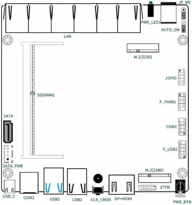 Rich interfaces: I226×6 2.5G-LAN,2 xUSB3.0, 2 xUSB2.0, HDMI,DP,Type-C,1*COM supports data storage and system boot.