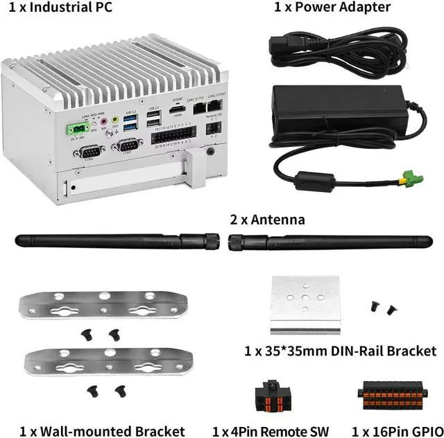 Package Includes:1xMini PC, 1xEar hooks, 1xPower adapter, 1x1.5M standard three-prong power cord (T-shaped), 1x1.5m yellow-green grounding wire, M3 for industrial PC and M6 for user cabinet, round loop lug.