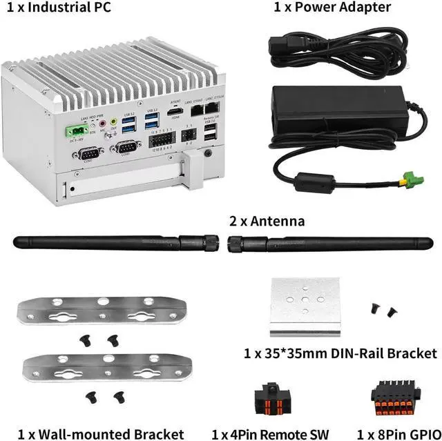 Package Includes:1xMini PC, 1xEar hooks, 1xPower adapter, 1x1.5M standard three-prong power cord (T-shaped), 1x1.5m yellow-green grounding wire, M3 for industrial PC and M6 for user cabinet, round loop lug.