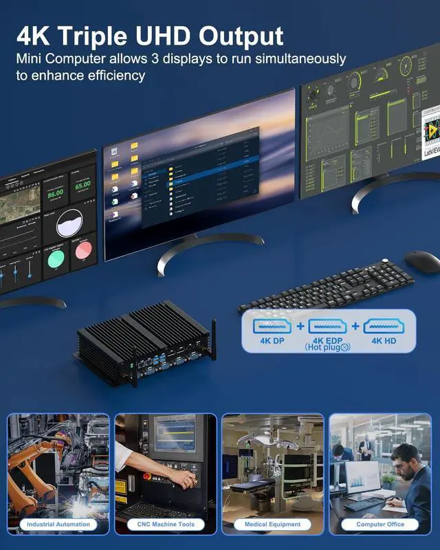 UHD Triple Displays The H4 Industrial Mini computer supports simultaneous three independent displays for incredible clarity and maximum productivity in your workflow, via with HD 2.0, DP and EDP outputs, HD output up to 4K @ 60Hz 4096 *2304, making it an ideal solution for digital signage, POS, office and more. It can be used as a PC or HTPC to home theater. You can use it in the office, in the training center, in the factory, in the Internet bar, or wherever you want.