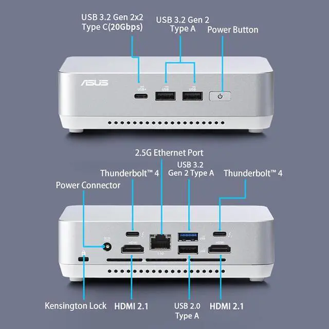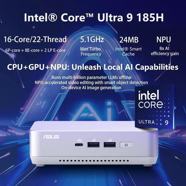ProcessorIntel Core Ultra 9 185H (16 cores, 22 threads, up to 5.1GH z)GraphicsIntel Arc Graphics (8 Xe-cores) + AI Boost NPUMemoryDDR5-5600 (2x SODIMM, expandable to 96GB)StoragePCIe 5.0 NVMe SSD (Dual M. 2 2280 slots)Display Output2x Thunderbolt 4, 2x HDMI 2.1 (4x 4K60 simultaneous) Front I/O2x USB 3.2 Gen 2 Type-A, 1x USB4 Type-C, Audio Combo JackRear I/O2x Thunderbolt 4, 2x USB 3.2 Gen 2, 2x 2.5G bE, DC InputDimensions140 x 140 x 72 mm ( 1.4L ) Technical