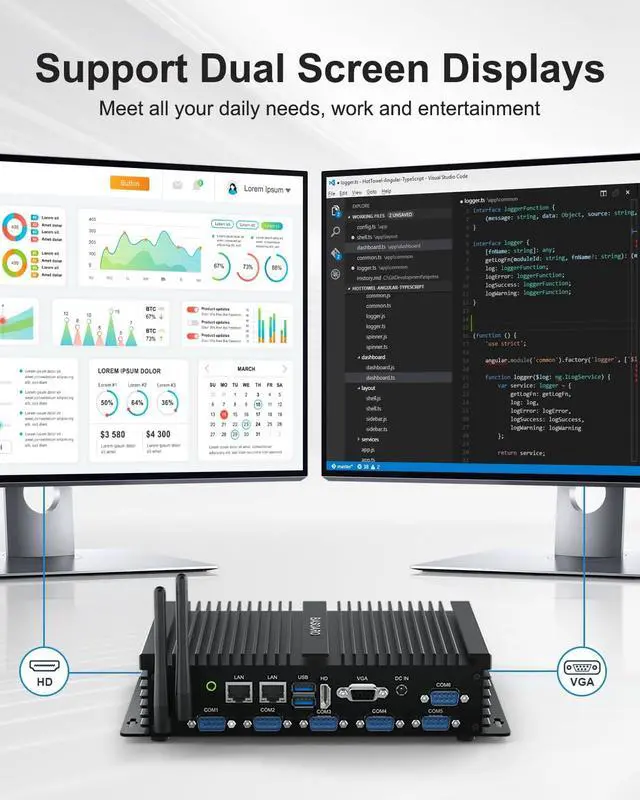 Fanless industrial pc equipped with VGA and HD ports to connect dual monitors, help you easily solve multiple tasks and double your productivity.