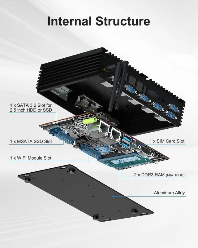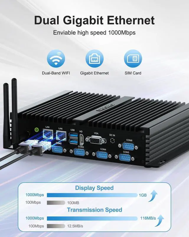 BASOARO industrial pc fanless computer is designed to power your project with versatile connectivity and impressive networking capabilities. 4 x USB 3.0, 2 x USB 2.0, HD and VGA port support up to 2 simultaneous 4K displays.