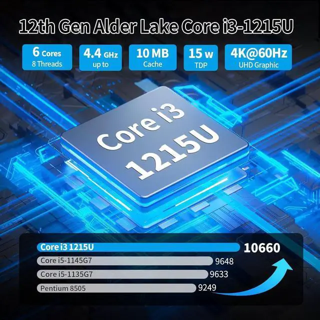 CPU: i3-1215U (6C (2 Performance + 4 Efficiency) /8T, up to 4.4GHz, 15W TDP) with UHD Graphics (64EU).