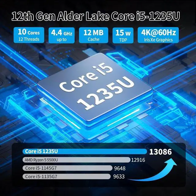 CPU: i5-1235U (10C (2 Performance + 8 Efficiency) /12T, up to 4.4GHz, 15W TDP) with Iris Xe Graphics (80EU).