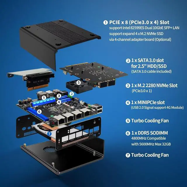 I/O: 2 x SFP+, 4 x ETH, 1 x USB3.0, 5 x USB2.0, 1 x HD, 1 x DP, 1 x Type-C, 1 x ON/OFF, 1 x DC In, 1 x RST, 1 x TF slot, 1 x SIM slot, 1 x SPK/MIC.