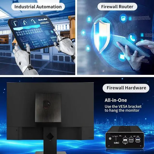 Packing List: 1 x SJRC Firewall 10G Mini PC, 1 x Power Adapter, 1 x Power Cable, 1 x SATA Cable, 1 x 4 Pin Fan Cable, 1 x VESA Mount.