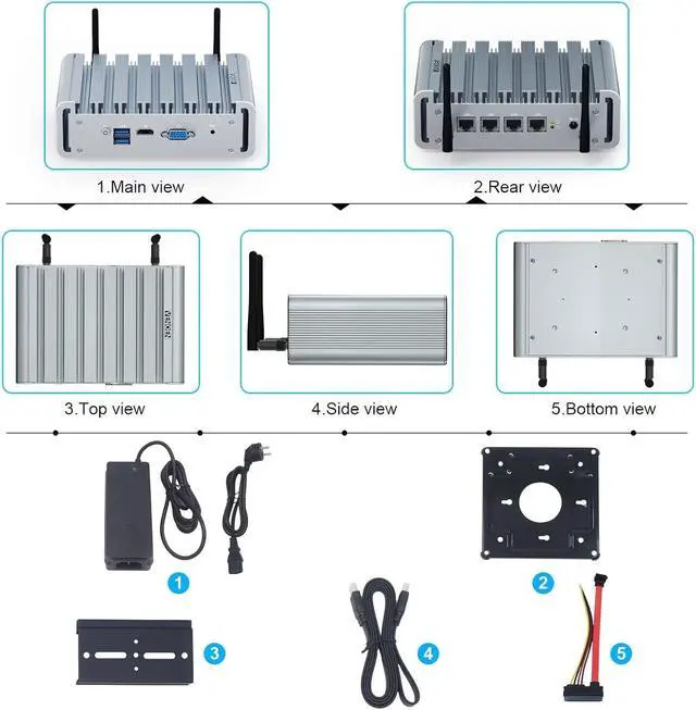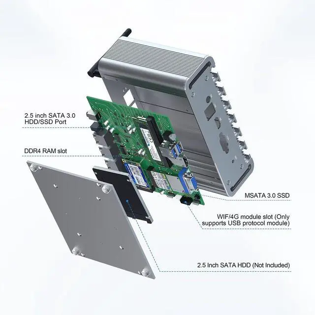 CPUCeleron J4125 (4M cache, base frequency 2.0 GHz up to 2.70 GHz 4 cores 4 threads)GDUUHD Graphics 600RAM1 x DDR4 260Pin SODIMM slot, MAX 16GB 2400MHz Storage1 x MSATA SSD + 1 x SATA3.0 slot for SATA HDD/SSDOperating systemSupports Win11/10 / Linux / Firewall SoftwareWifiMini PCI E slot, supports Wifi Model / 4G module (2 choose 1) SIMSIM slot onboard (25 mm x 15 mm), supports SIM cardDisplay port1 x HD port + 1 x VGA portLAN4 x i225 2.5 Gigabit RJ45 LanFunctionAuto Power On , RTC , WatchDog ect.Package contents1 x Mini-PC, 1 xPower Adapter, 1 x HD cable, 1 x SATA cable, 1 x VESA mount, 1 x DIN-SCHIENEN mountdimension177mm x 125mm x 55mm 1Dual Display 4K2Package include3VESA Mount Compact PC How to use the 4G module?
