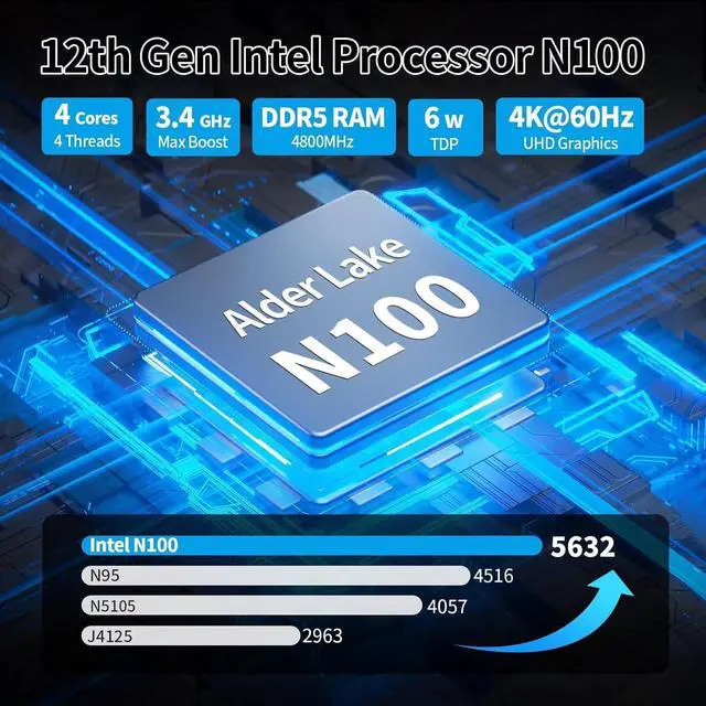 CPU: Intel N100 (Alder Lake-N, 4C/4T, up to 3.4GHz, 6W TDP).