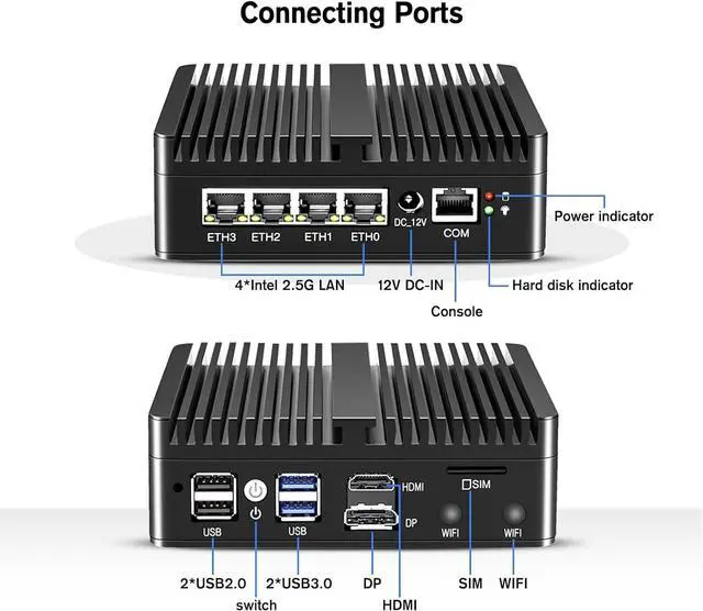 • Rich interfaces: 4 x 2.5G i226V-LAN, 2 x USB3.0, 2 x USB2.0, 1 x RJ45 COM console, 1 x HDMI + 1 x DP dual display interfaces support 4K@60Hz, 1x 4G/3G SIM slot(SIM slot and MPCIE wireless slot, support WiFi/4G/3G(only USB protocol, 3 choose 1), enabling versatile 4G LTE connectivity options).