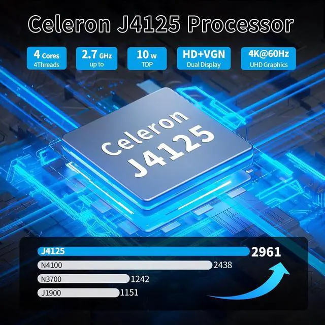 J4125 (up to 2.7 GHz, 4C/4T, 4 MB cache, 10W TDP).