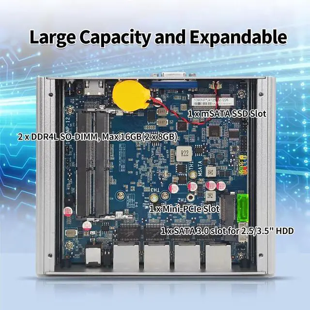 Dual DDR4 SO-DIMM slots supporting memory types up to DDR4 2400 MT/s, with a maximum capacity of 16GB. It also includes 1 x mSATA SSD Slot, 1 x SATA 3.0 Slot (SATA Cable Included). And 1xMini PCI-E expansion slot for wireless functions such as Wifi/bt/4G