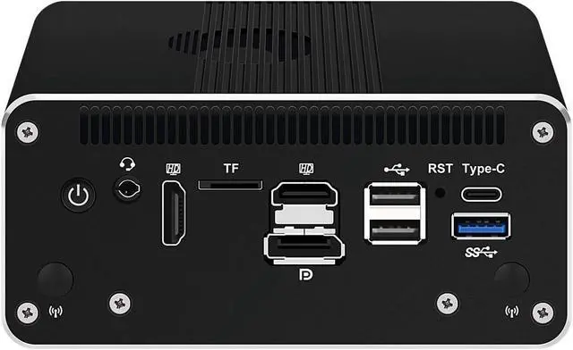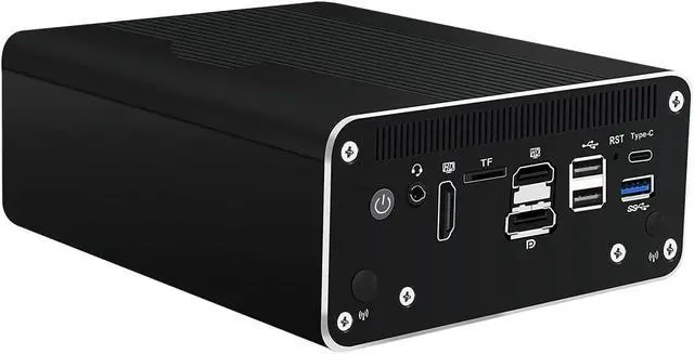 • RJ51 designed with power on/off, audio, 2 x hdmi2.0, tf for data storage/system boot, dp++1.4, 2 x usb2.0, rst, 10gbps type-c for data/dp 4096x2160@60hz, 5gbps gen1 usb3.2, console, dc_in, 8 x lan, 154.6x 131.7 x 60mm, 1.6kgs