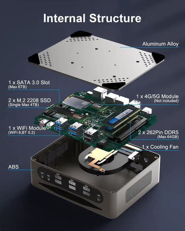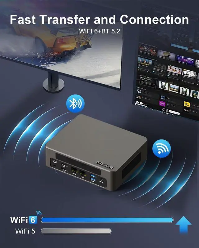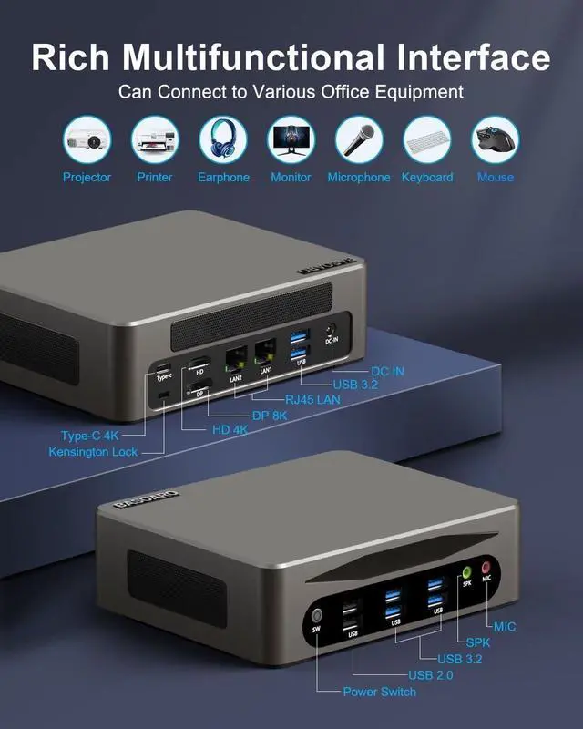 CPUCore i5-1235U Processor(10C/12T, up to 4.4GH z, 12 MB); Core i7-1255U Processor(10C/12T, up to 4.7GH z, 12 MB)CPUCore i5-1340P Processor(12C/16T, up to 4.6GH z, 12 MB); Core i7-1360P Processor(12C/16T, up to 5.0GH z, 18 MB)GPUIris Xe GraphicsMemory2 x DDR5 262Pin SODIMM slot, max 64GBStorage2 x M. 2 2280 SSD slots (Single Max 4TB; NVME1 for NVME Gen3 X4/SATA SSD, NVME2 for NVME Gen4 X4 SSD); 1 x SATA 3.0 slot for 2.5" HDD/SSDLAN2 x RJ45 LANDisplayDP 8K@30HZ + HD 4K@60HZ + Type-C 4K@60HZUSB6 x USB 3.2, 2 x USB 2.0W iFi & BTWiFi 6 + BT 5.2; support 4G/5G Module and SIM Card (not included) Operating SystemWin 11 Pro, Win 10 Pro, LinuxSize & Weight169x138x52 mm ( 6.6 x 5.4 x 2.0 inches); 1.9KG ( 4.1 pounds)Case MaterialAluminum + ABS housingDC IN19V 4.74A (90W) Other FunctionsSupport Auto Power On, Wake on LAN, PXE (Legacy), Watchdog 1Rich Ports22 RJ45 LAN3Mini Size1Office2Meeting3Home Theater4Billboard BASOARO BAM9 Mini Desktop PC Win 11 Specification