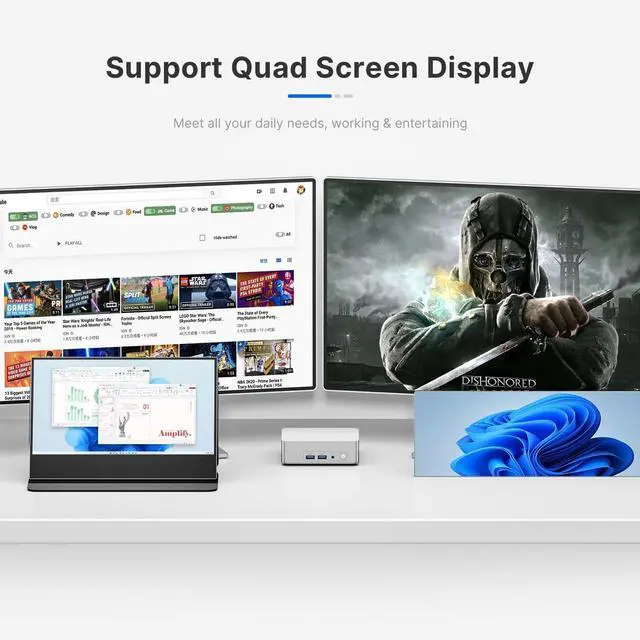 Quad Display Output, 8K@60HzAG1 mini pc has Intel Iris Xe Graphics eligible, supports Quad Display output via 2* HDMI (4K@60Hz), Thunderbolt 4x2 (8K@60Hz), which enables you to multi-task easily. Fully capable of browsing the internet, use Microsoft Office, design application.